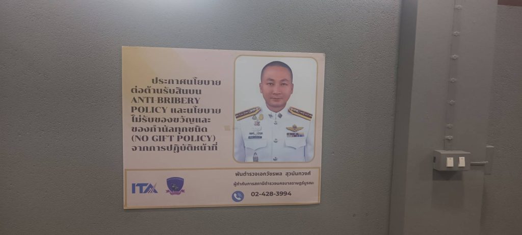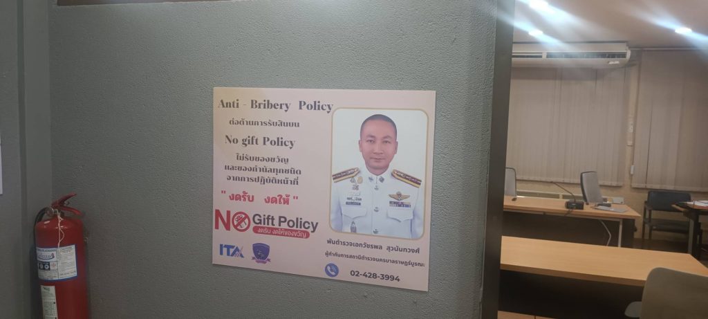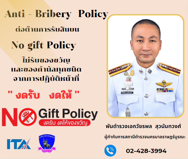 เเสดงประกาศนโยบายการต่อต้านการรับสินบน ( Anti-Bribery Policy ) โดยผู้บริหารสูงสุดของสถานีตํารวจปัจจุบันเเละให้เผยเเพร่ฉบัเป็นภาษาอังกฤษควบคู่ภาษาไทย